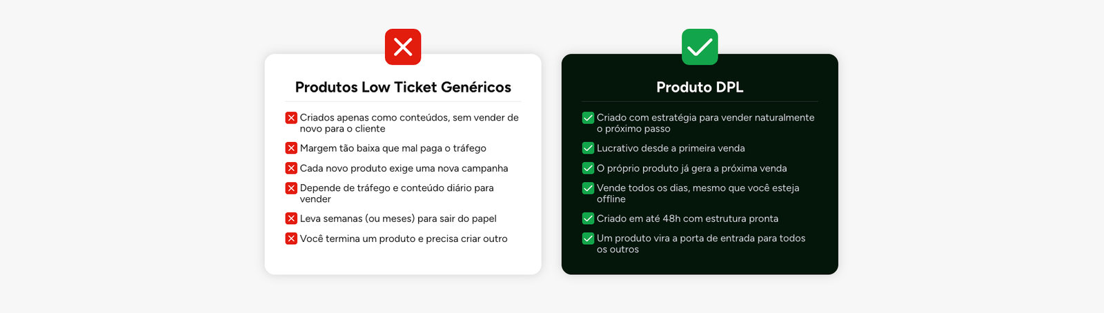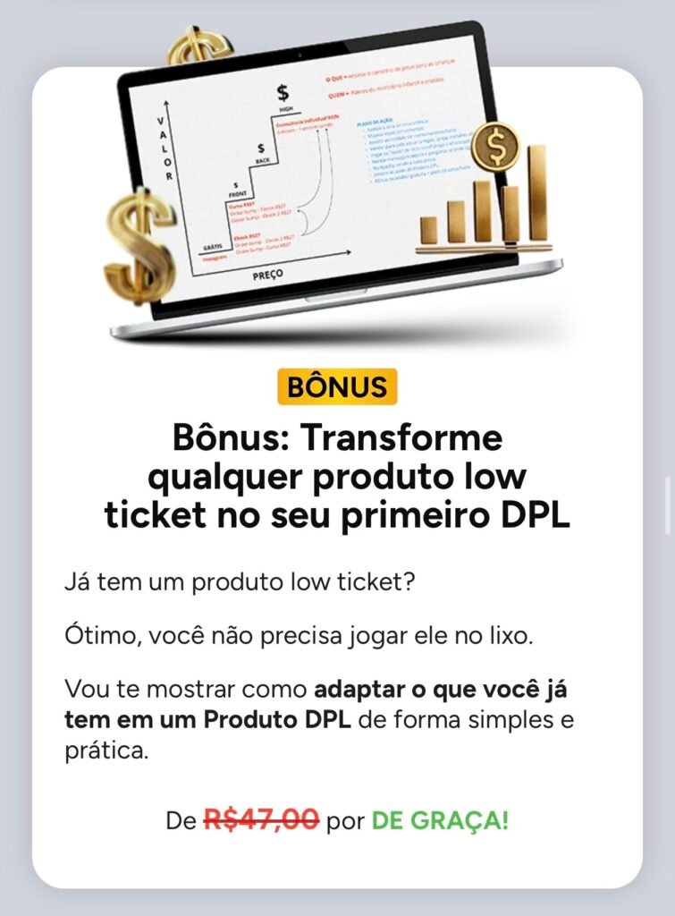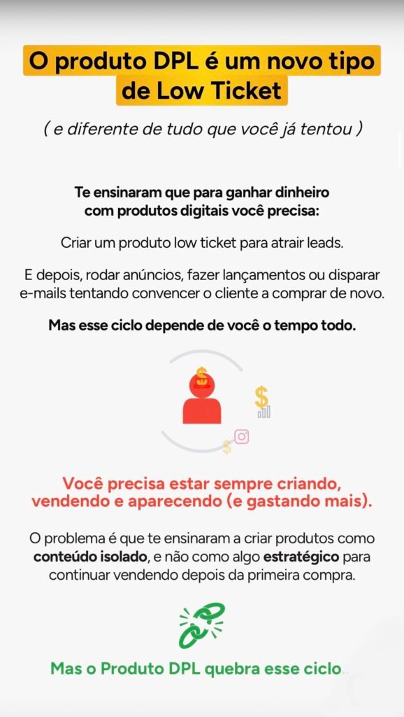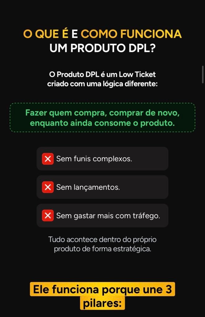 O Produto DPL é um Low Ticket criado com uma lógica diferente: Fazer quem compra, comprar de novo, enquanto ainda consome o produto.