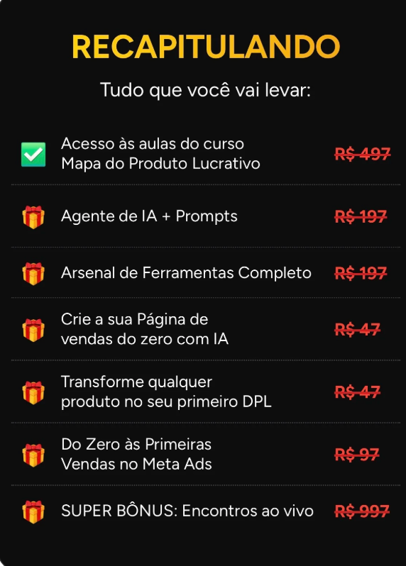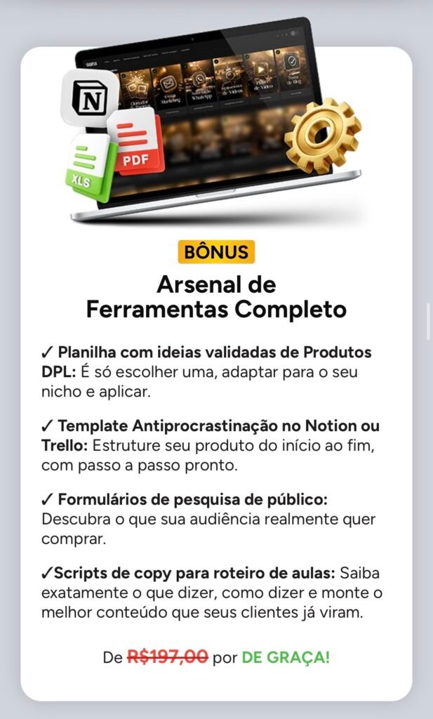 Sim! Além do curso, você recebe uma planilha com ideias de Produtos DPL prontas pra adaptar. É só escolher, ajustar e começar a vender.